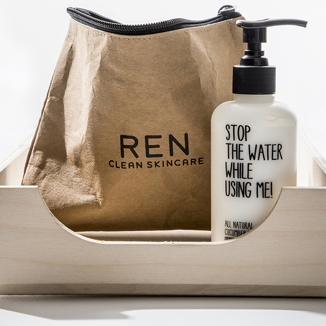 Selv er jeg faldet for toilettasken, som er en kampagne-ting, REN kører (jeg tror ikke, at den kan købes). Den er lavet af affaldspapir, og bagpå står der: