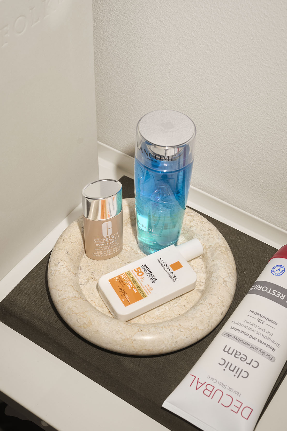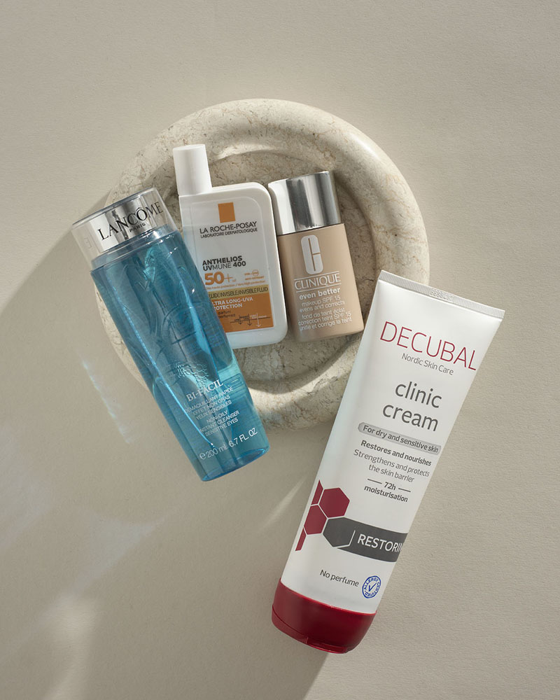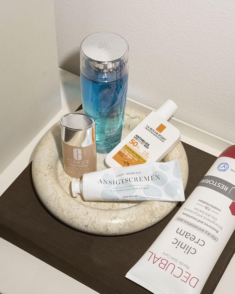 Er det i sommerhalvåret supplerer hun med solbeskyttelse, hvor favoritten er La Roche-Posay Anthelios – parfumefri, let og tyndtflydende. Den anbefaler hun også til sine teenagere.