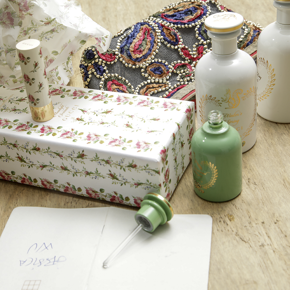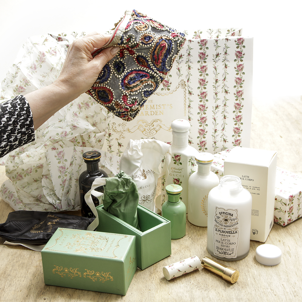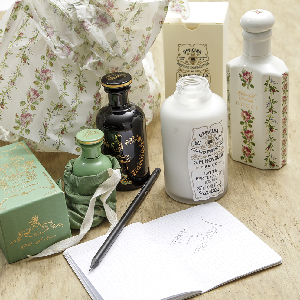 Det er ligegodt utroligt, at man som rendyrket minimalist pludselig bliver draget af krummelurer og romantik i en grad, der sender en (mig) tilbage til et vist marmorskuffedarium. Hos min farmor var det tunge toiletbord soveværelsets pryd – med duft på kringlede flasker, buttede glasskåle med flerfarvede vatkugler, koldcremer og faste sæber i lange baner. Dengang som nu ser jeg mig selv æde det hele råt og prioriterer pludselig håndfaste sæber på badeværelset – ikke at nogen vover at bruge dem sammen med vand – imens jeg får lyst til at prøve, snuse, bade i det hele fra Guccis The Alchemist’s Garden-kollektion. Og ikke mindst: Tage til Firenze-apoteket Farmaceutica di Santa Maria Novella.